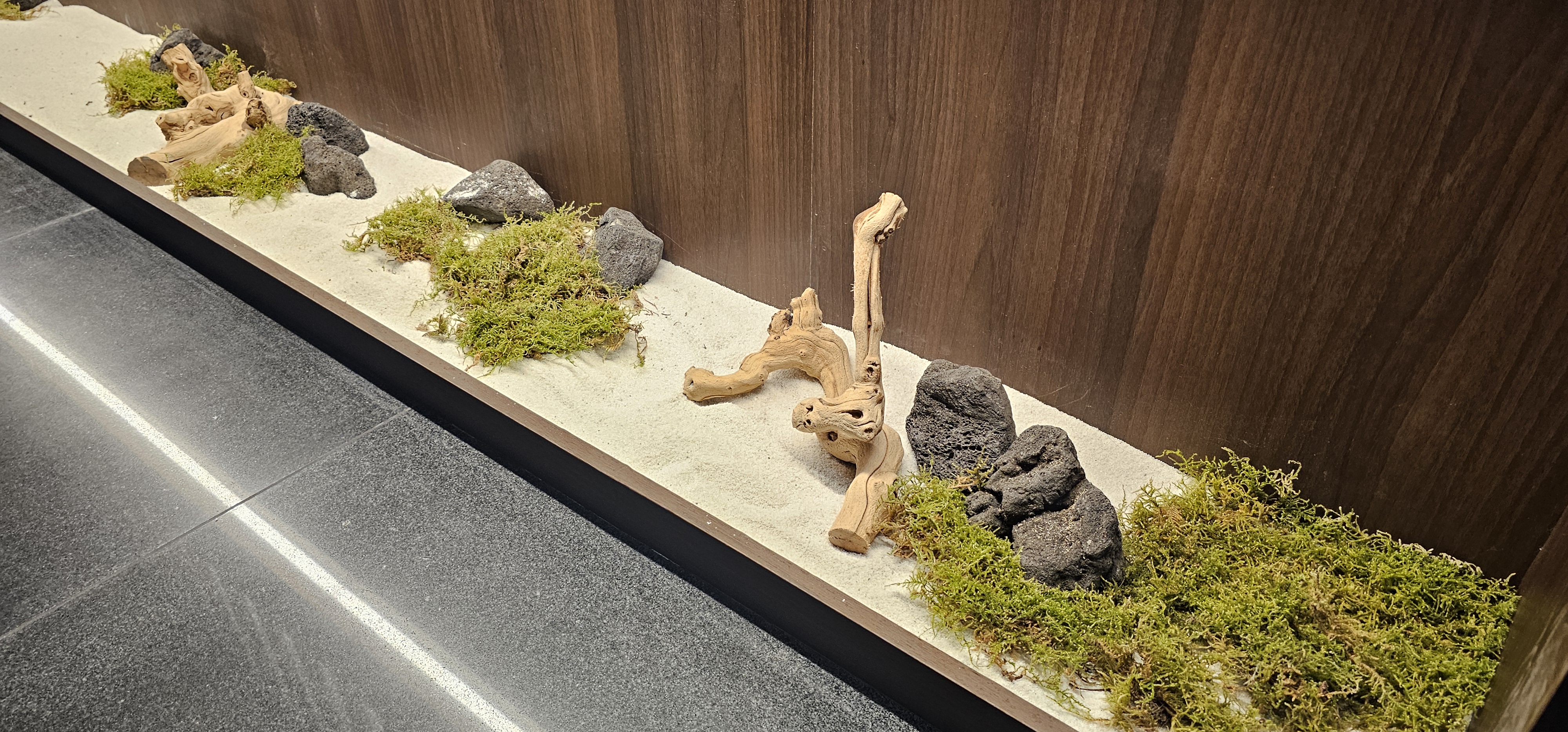 식당입구 벽체의 좁은 공간을, 무시한듯? 이용하여 시선을 끌어주는 일본식 미니정원을 표현했습니다.